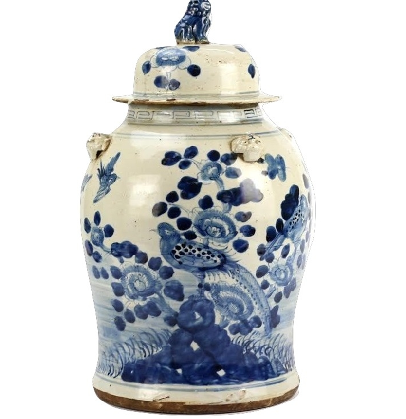 Chunky bird jar is a classic jar that features a bird scene and is topped with a charming foo dog top. Slightly antiqued.